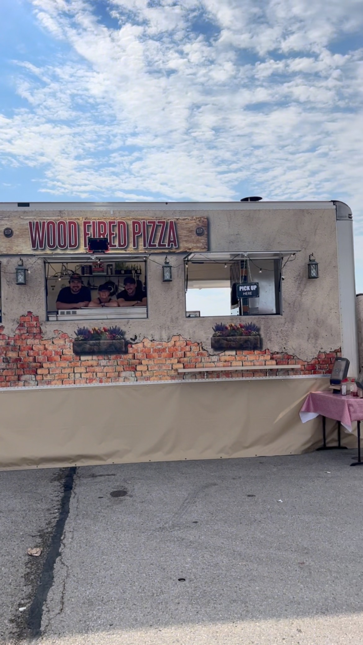 Guests order and pick up from the trailer. Pizza served on compostable, biodegradable plates.